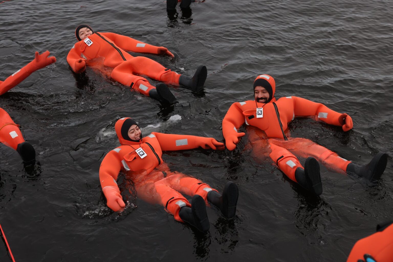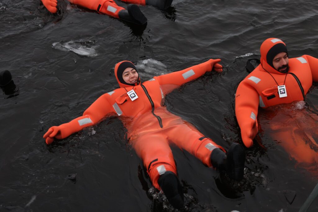 É impressionante como, mesmo dentro de um mar congelado, conseguimos sentir conforto e segurança. A tecnologia do traje permite que você aproveite o momento com calma, observando o céu, o gelo ao redor e o silêncio absoluto do Ártico.