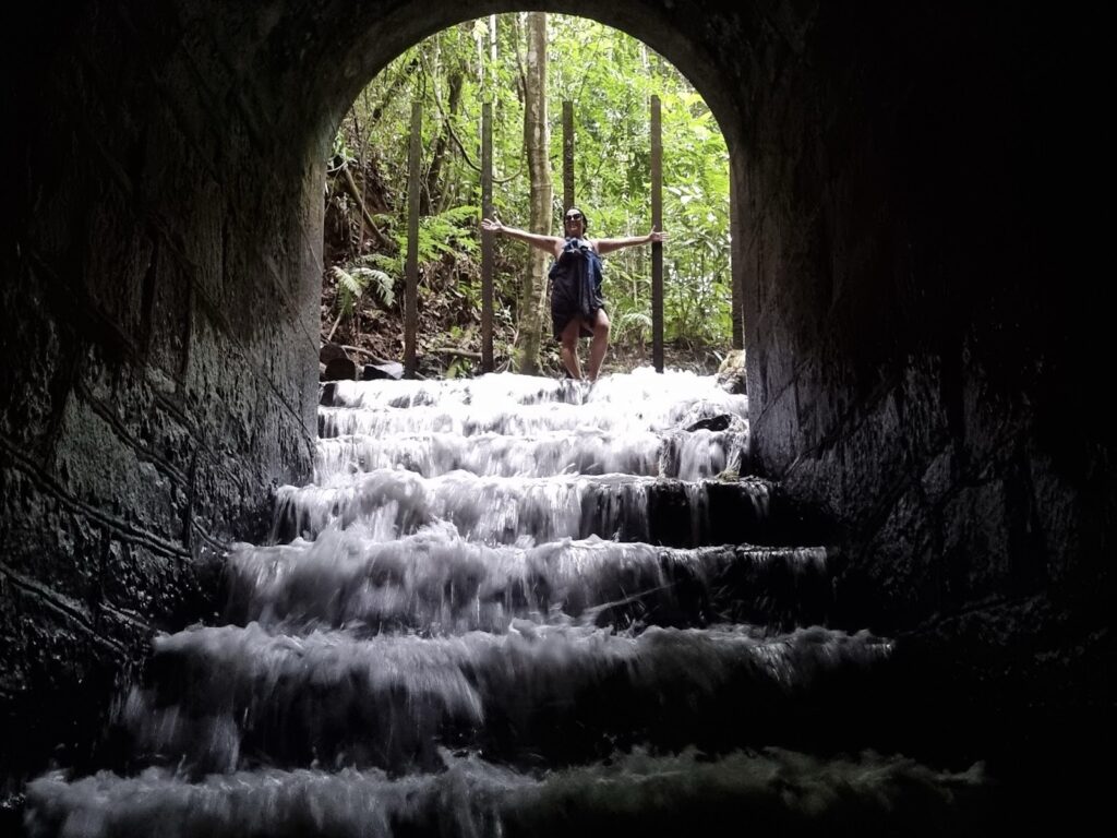 Ao alcançar a entrada do túnel, muitos visitantes param por um momento antes de encarar os 65 degraus que descem para dentro dele. E, se você estiver se perguntando se é difícil, a boa notícia é que a água raramente passa da altura da canela, e o percurso acontece com calma e segurança.